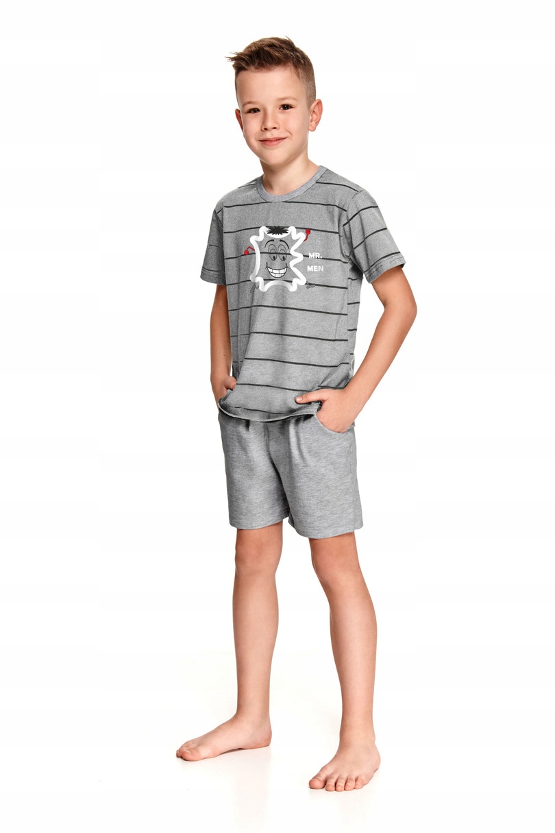 Piżama chłopięca wysokiej jakości, z krótkim rękawem. Koszulka z przodu ozdobiona nadrukiem. Do kompletu krótkie jednolite spodenki z kieszeniami.