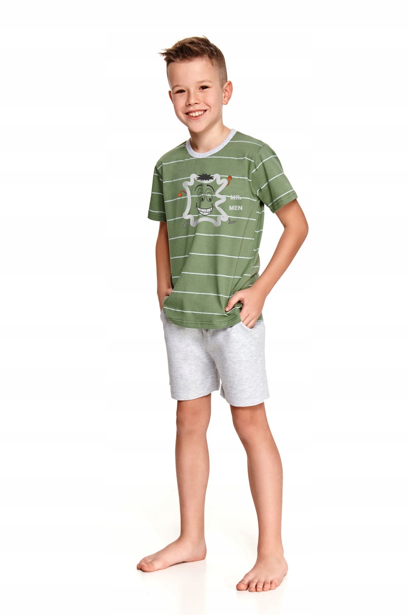Piżama chłopięca wysokiej jakości, z krótkim rękawem. Koszulka z przodu ozdobiona nadrukiem. Do kompletu krótkie jednolite spodenki z kieszeniami.