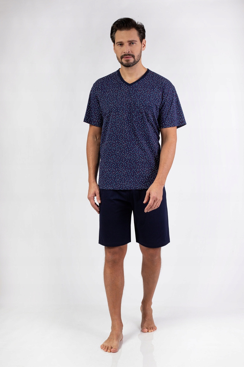Klasyczna piżama męska z krótkim rękawem uszyta z wysokogatunkowej bawełny. Koszulka wzorzysta z dekoltem w serek. Do kompletu spodnie jednolite z krókimi nogawkami.