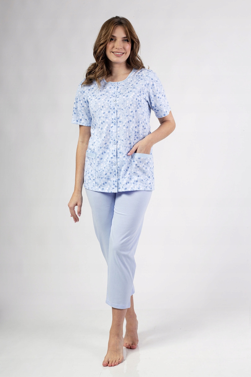 Piżama damska 694 od marki REGINA to połączenie wygody i elegancji. Wykonana w 100% z delikatnej bawełny, zapewnia komfort i przewiewność przez całą noc. Koszulka z krótkim rękawem, zapinana na guziki, ozdobiona subtelnym wzorem, dodaje stylowego charakteru. Dwie praktyczne kieszonki u dołu zwiększają funkcjonalność. Gładkie spodnie o długości 3/4 gwarantują swobodę ruchów i wygodę noszenia. To idealny wybór dla kobiet ceniących komfort i klasyczny design w nocnej garderobie.