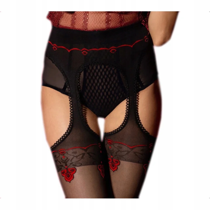 Rajstopy Amour Rouge 20 Den ● imitujące pończochy i zastępujące set pasa z podwiązkami ● w klasycznej czerni z czerwonym orientalnym motywem wokół uda ● wykonane w technologii wysokogatunkowego oplotu 3D ● zwiększona trwałość i sprężystość ● zapewniają odczucie komfortu dla skóry i maksymalnego przylegania do nogi ● płaski szew i niewidocznie wzmocniona część palcowa