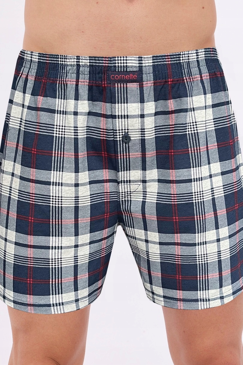 Bokserki męskie uszyte z wysokiej jakości wzorzystej bawełny. Wygodna guma w pasie obszyta bawełną. Rozporek zapinany na guzik. Pakowane w pudełko.