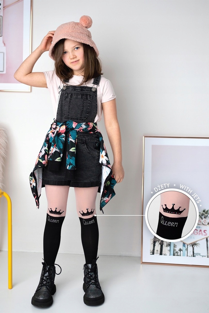 Dziewczęce rajstopy wzorzyste wykonane z mikrofibry z doklejonymi dżetami. Dzięki użyciu technologii 3D rajstopy są miłe w dotyku, miękkie i dobrze przylegają do nóg.Wykończenie majtkowe. Wszyty mały klin. Płaskie szwy.