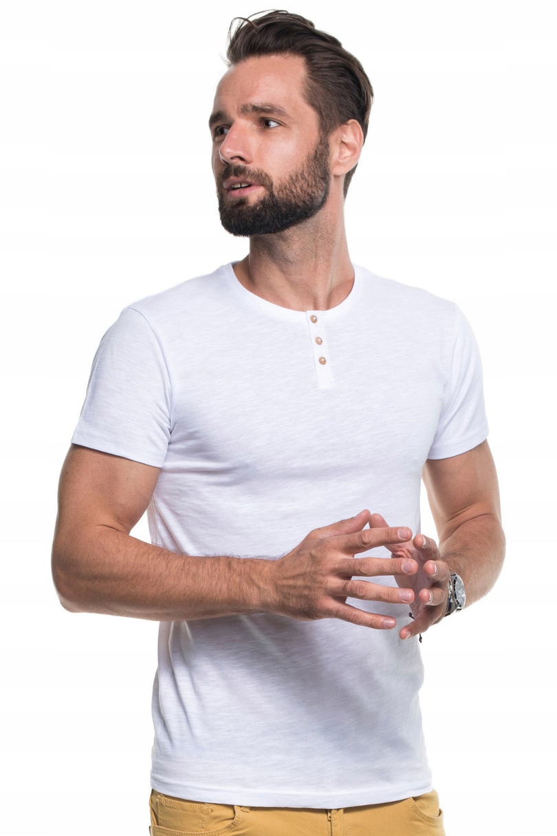 T-shirt męski z guzikami. Dopasowany krój, miękki i gładki materiał single jersey typu slub. Elastyczny ściągacz, ozdobna taśma wzmacniająca na karku, taśma wzmacniająca na ramionach, dekolt rozpinany z ozdobnymi, drewnianymi guzikami. Gramatura: 170g/m2. Skład: 100% bawełna ring-spun, grafit melanż: 70% bawełna, 30% poliester.