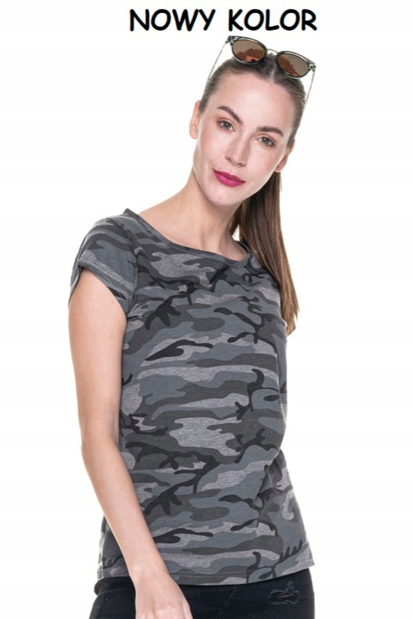 Koszulka moro damska. Miękki i gładki materiał single jersey z nadrukowanym wzorem moro, dekolt wykończony lamówką, taśma wzmacniająca na ramionach, podwójne szwy. Gramatura: 170g/m2. Skład: 100% bawełna półczesana.