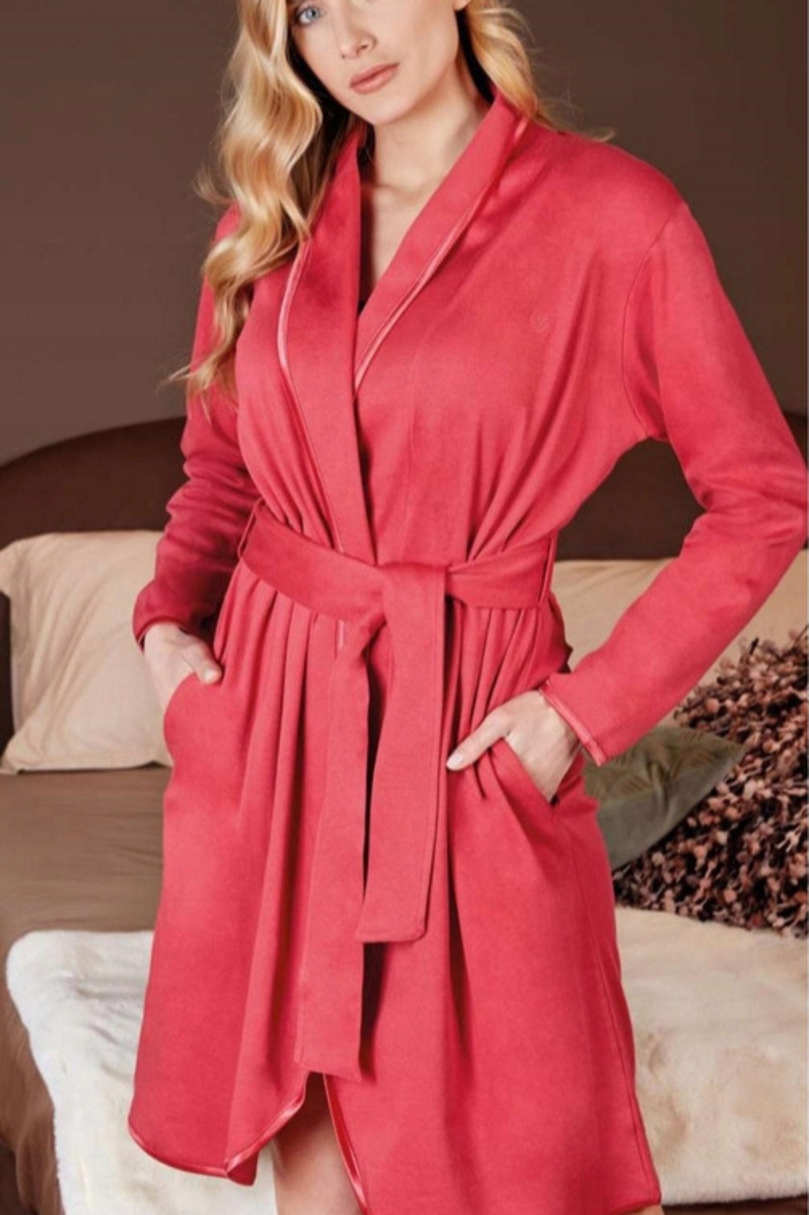 Szlafrok damski z kołnierzem i kieszeniami, wykonany z bawełny. Wiązany w pasie. Wykończony delikatną lamówką. Dostępny w dwóch wersjach kolorystycznych.