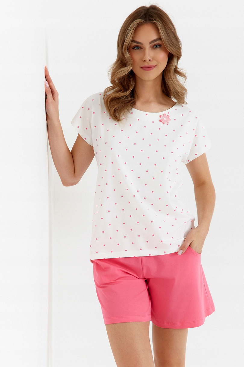 Urocza i komfortowa piżama damska w delikatnym, kobiecym stylu. Wykonana z wysokogatunkowego singla jersey z dodatkiem elastanu, zapewnia doskonałą miękkość i przewiewność. Bluzka w kolorze écru ozdobiona jest subtelnym wzorem drobnych różowych kropek. Oversizowy krój gwarantuje pełną swobodę ruchów, a krótkie rękawy i okrągły, starannie odszywany dekolt z haftowanym kwiatkiem z tiulu dodają uroku. Do kompletu dołączone są dłuższe spodenki w kolorze różowym, wyposażone w praktyczne kieszenie. To połączenie wygody i stylu, idealne na spokojne noce i leniwe poranki.