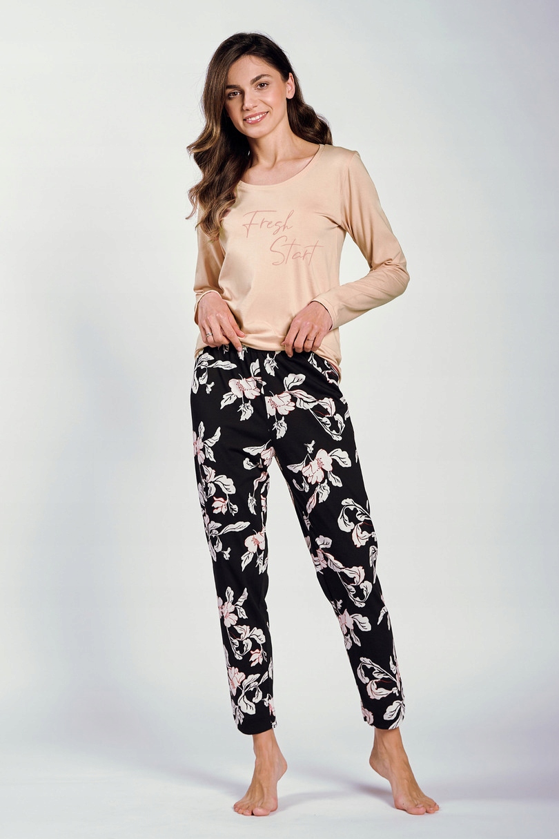 Piżama damska z długim rękawem, uszyta z delikatnej bawełny. Dekolt okrągły, przód ozdobniony nadrukiem. Do kompletu wzorzyste długie spodnie.
