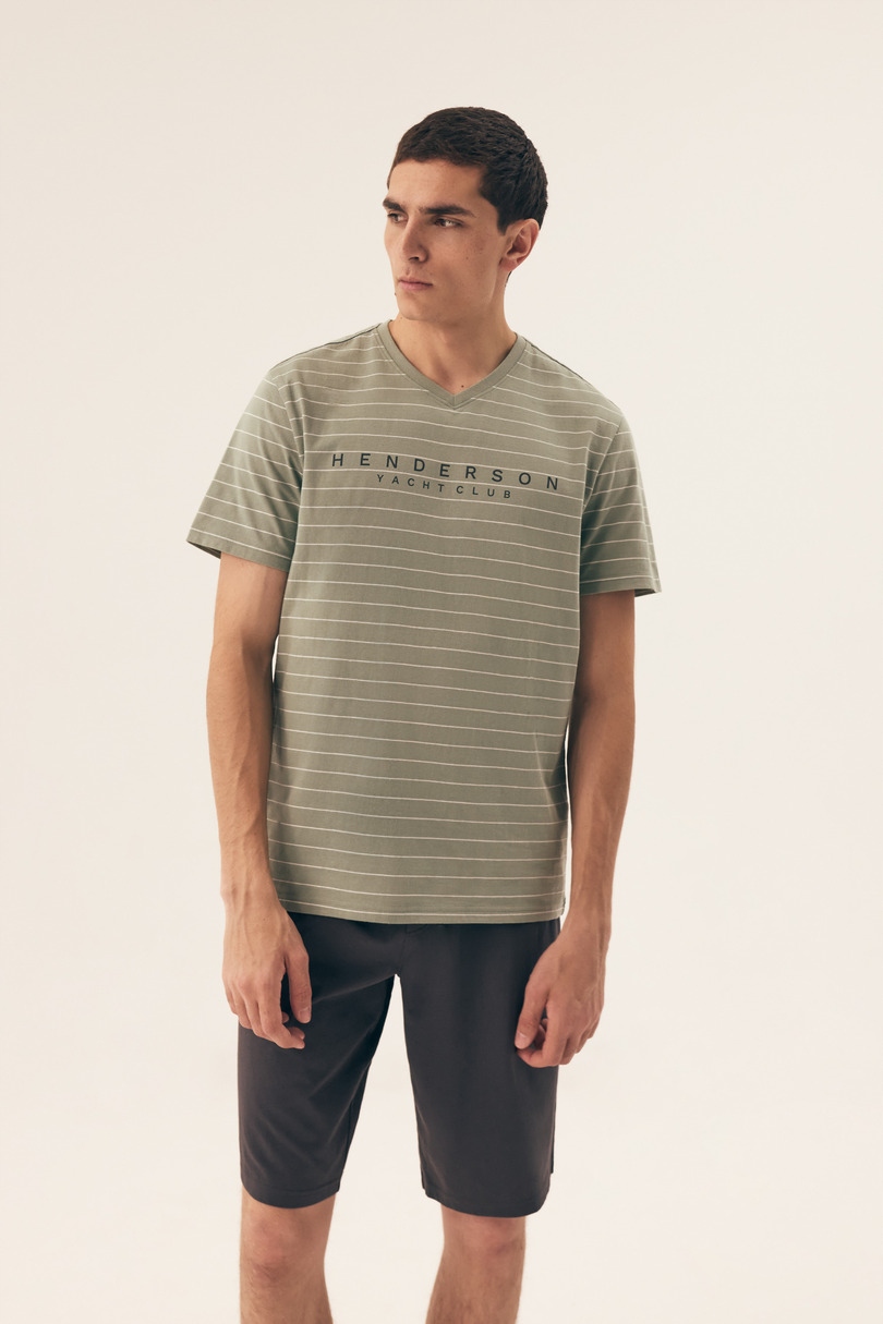 Piżama męska wykonana z bawełny. Koszulka w delikatne paski z dzianiny, dekolt w serek. Spodnie z cienkiej tkaniny bawełnianej jednolite. Długość do kolan. W pasie guma i sznurek do regulacji obwodu pasa. Dostępna w dwóch wersjach kolorystycznych.