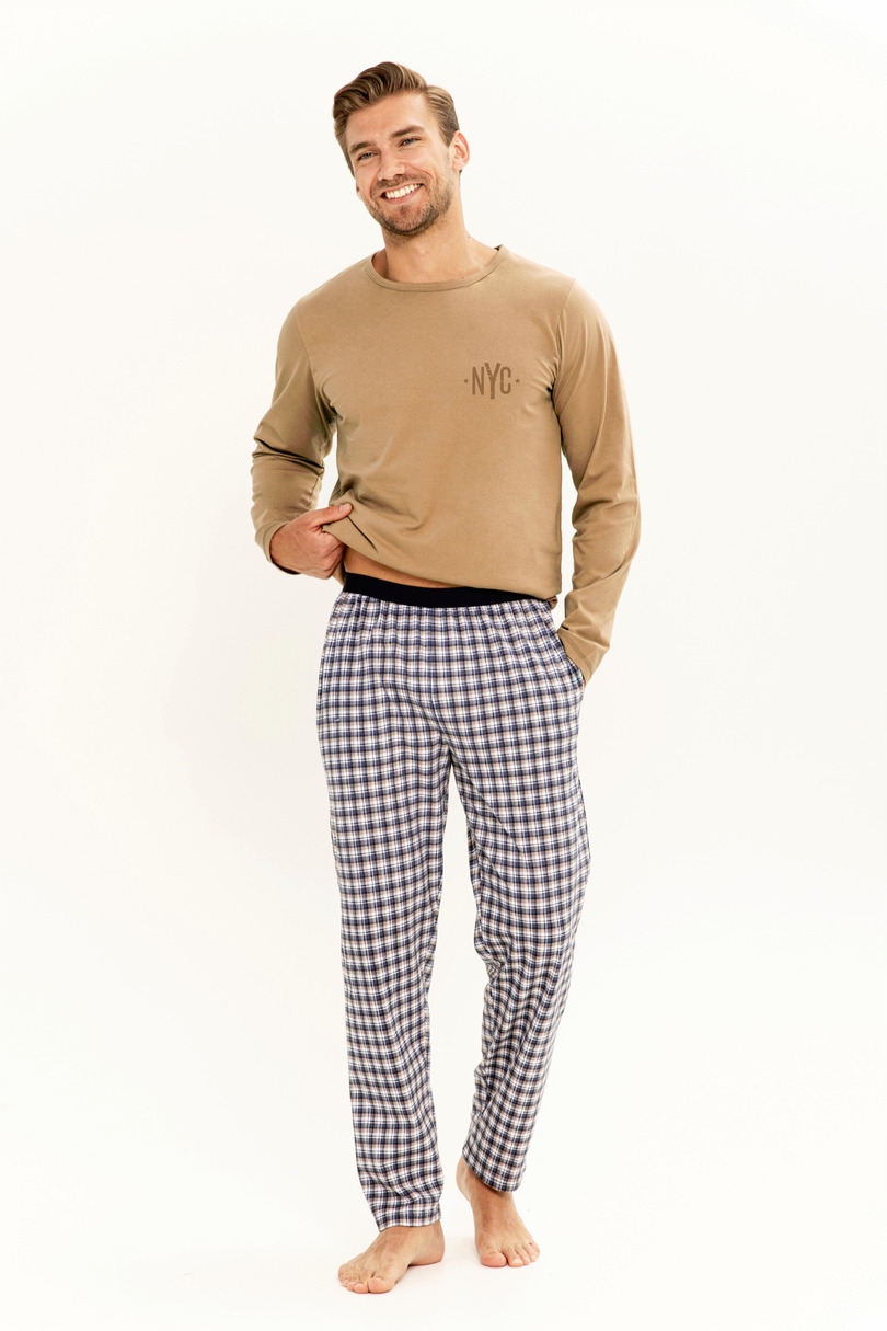 Piżama męska z długim rękawem, dekolt okrągły, na wysokości klatki piersiowej nadruk. Do kompletu długie spodnie w kratę z prostymi nogawkami i kieszeniami.