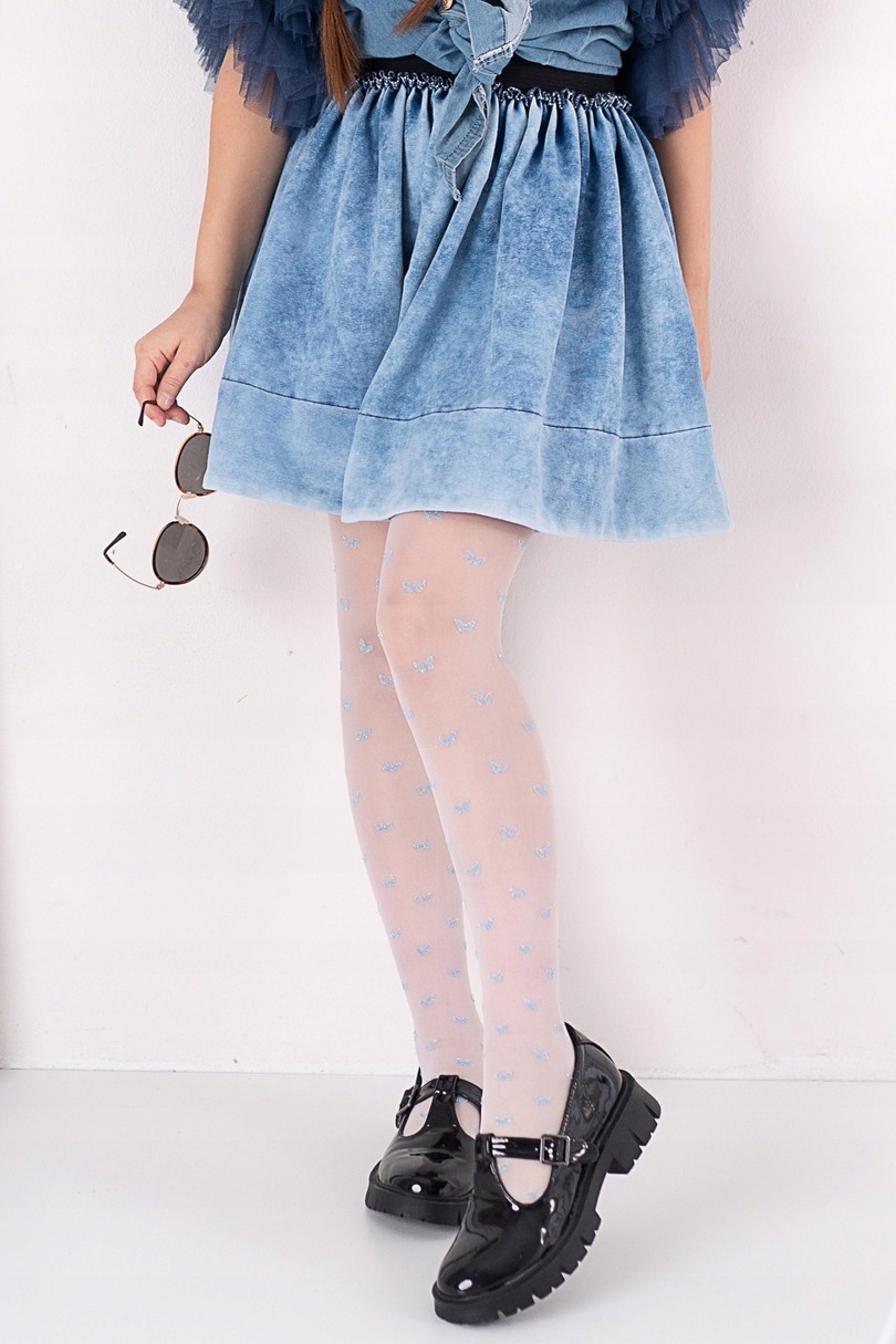 Dziewczęce rajstopy wzorzyste wykonane z przędzy podwójnie oplatanych, z dodatkiem przędzy metalizowanej. Wszyty klin. Wzór w delikatne motyle pokrywa równomiernie całoś rajstop.