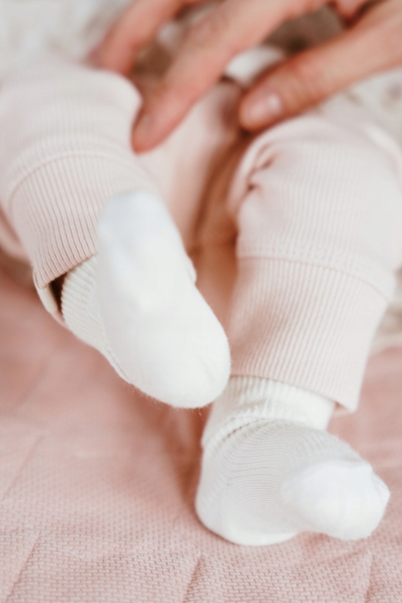 Gładkie bambusowe skarpetki niemowlęce, wykonane z doskonałej jakości przędzy z wywijanym ściągaczem wykończonym pikotką.