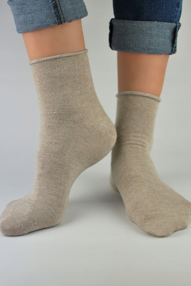 Skarpety damskie bezuciskowe z połyskującą lureksową nitką. Skład surowcowy: 79% Bawełna, 16% Poliamid, 4% Elastan.