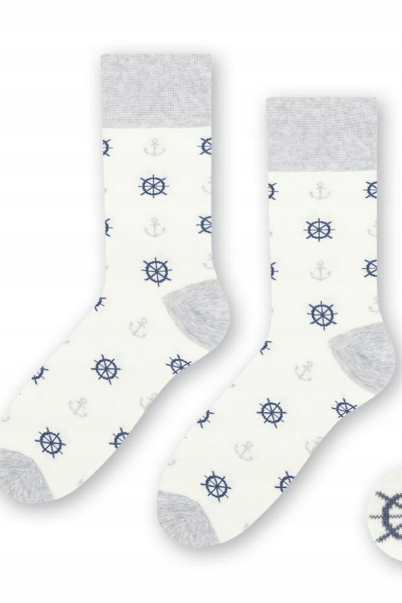 Skarpety męskie w marynistyczne wzory, wykonane z cienkiej i delikatnej przędzy bawełnianej z dodatkiem włókien elastycznych.