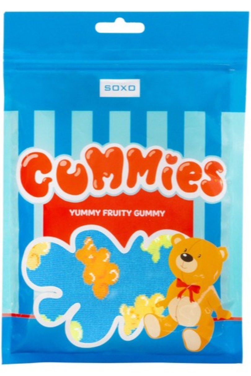 Skarpetki z motywem żelków. Skład surowcowy, w zależności od modelu: 78% Bawełna, 20% Poliamid, 2% Elastan lub 72% Bawełna, 26% Poliamid, 2% Elastan.