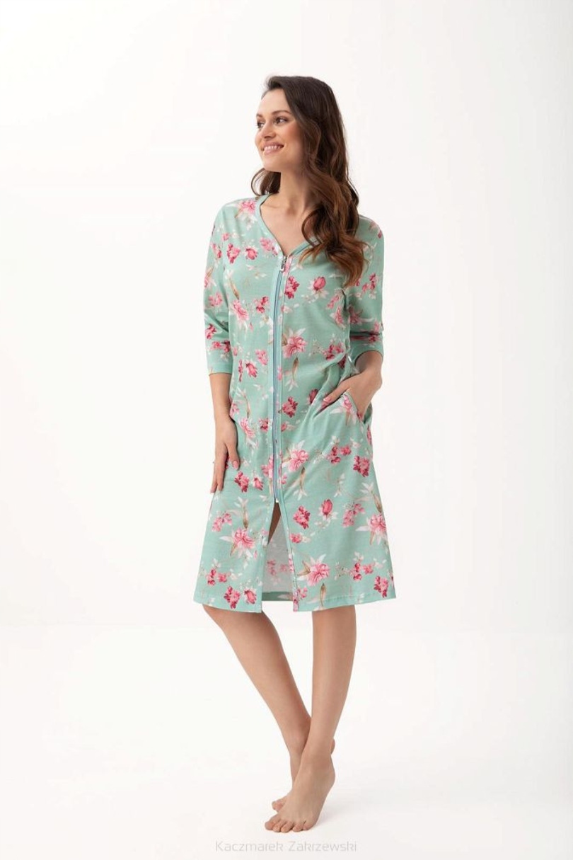 Szlafrok damski, wzorzysty, dekolt w zaokrąglony serek, zapinany na zamek błyskawiczny, z kieszeniami, rekawy długości 3/4, długość około kolan.