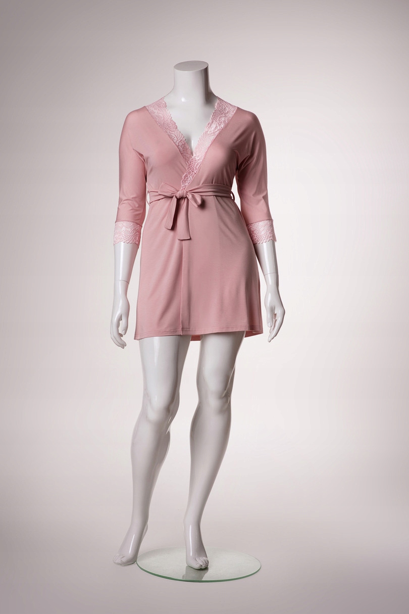 Wiskozowy szlafrok damski o klasycznym kroju, długość przed kolano. Dekolt i rękaw wykończony koronką, wiazany w pasie.