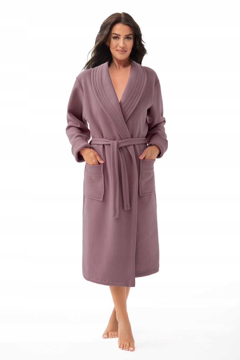 Elegancki szlafrok damski, wykonany z grubej dzianiny bawełnianej. Podomka z szalowym kołnierzem z długim rękawem, wiązany w pasie. Na wysokości bioder kieszenie.