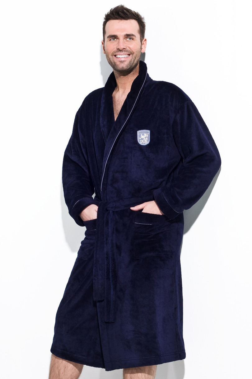 Szlafrok męski szalowy uszyty z miłej tkaniny dla ciała. Szlafrok wykończony kontrastującą lamówka. Na wysokości klatki piersiowej naszyta delikatna naszywka, na biodrach kieszenie, wiązany w pasie.