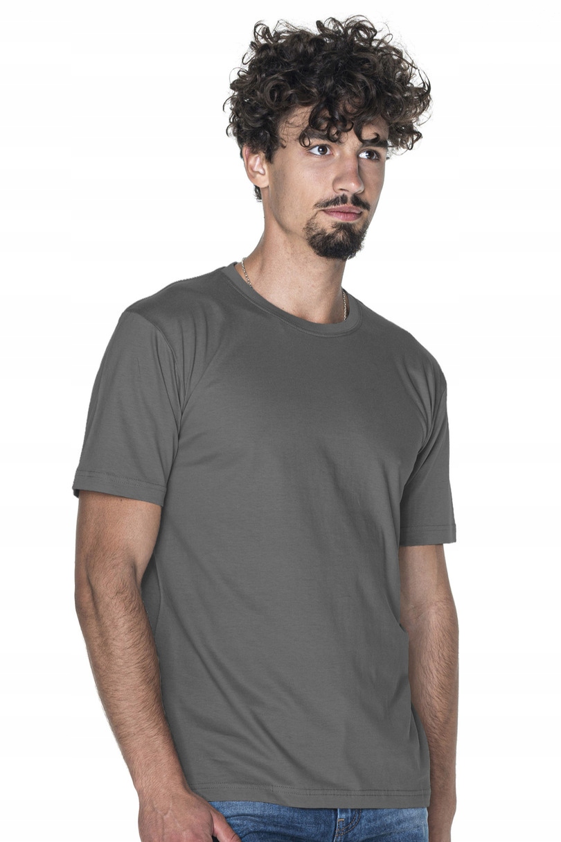 T-shirt męski z krótkim rękawem wykonany z dzianiny single jersey;klasyczny fason; materiał poddany praniu enzymatycznemu, dzięki czemu jest pozbawiony nierówności; wykończenie silikonowe materiału powodujące że jest miękki i miły w dotyku; dekolt wykończony dwuwarstwowym ściągaczem z elastanem zapewniającym dłuższą trwałość; kark i ramiona z taśmą wzmacniającą i stabilizującą, która pozytywnie wpływa na trwałość szwów; boki bezszwowe zapewniające lepszy komfort w noszeniu i dające większe możliwości nadruku; podwójne gęste szwy do których wykorzystano nici najwyższej jakości